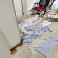 다량의 변사체 혈액, 부패액이 강마루 바닥에 스며들었으며 붙박이장 내부에는 파리 유충이 군집을 이루고 있었습니다.